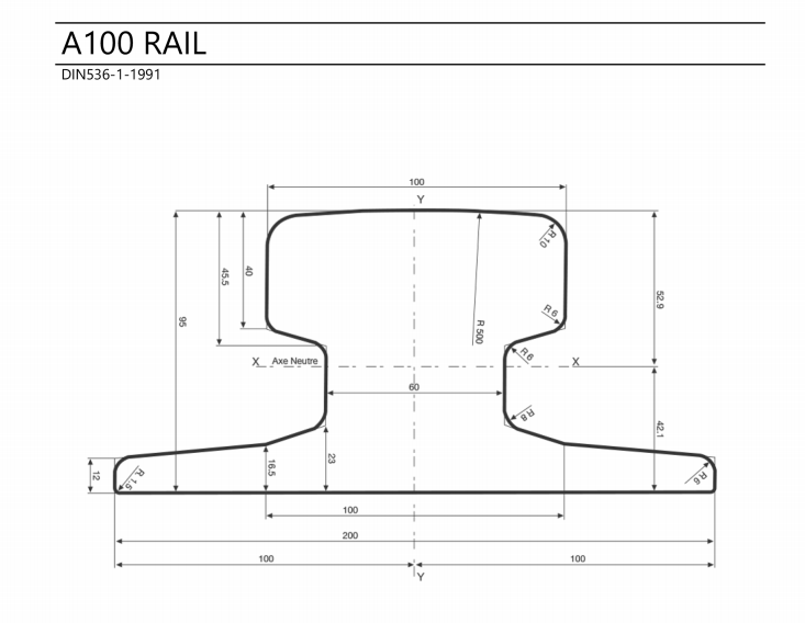 ZongXiang's A100 rail, certified to DIN 536 standards, is specifically designed for high-load, high-frequency industrial environments. Featuring a 100mm-wide head profile and constructed from U71Mn high-carbon steel. As a reputable crane rail supplier, ZongXiang specializes in providing high-quality DIN 536 a100 crane rails, manufactured strictly in accordance with German standards.